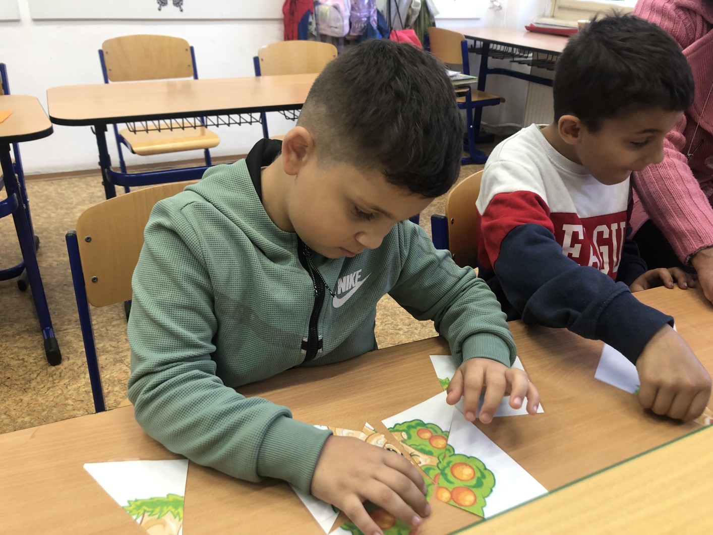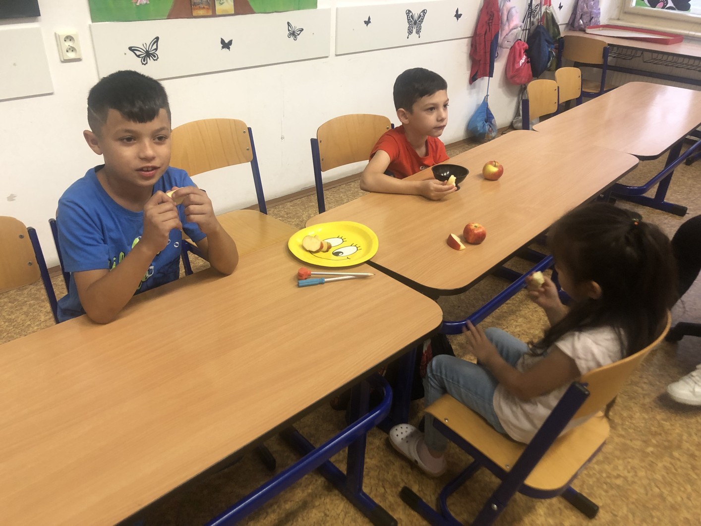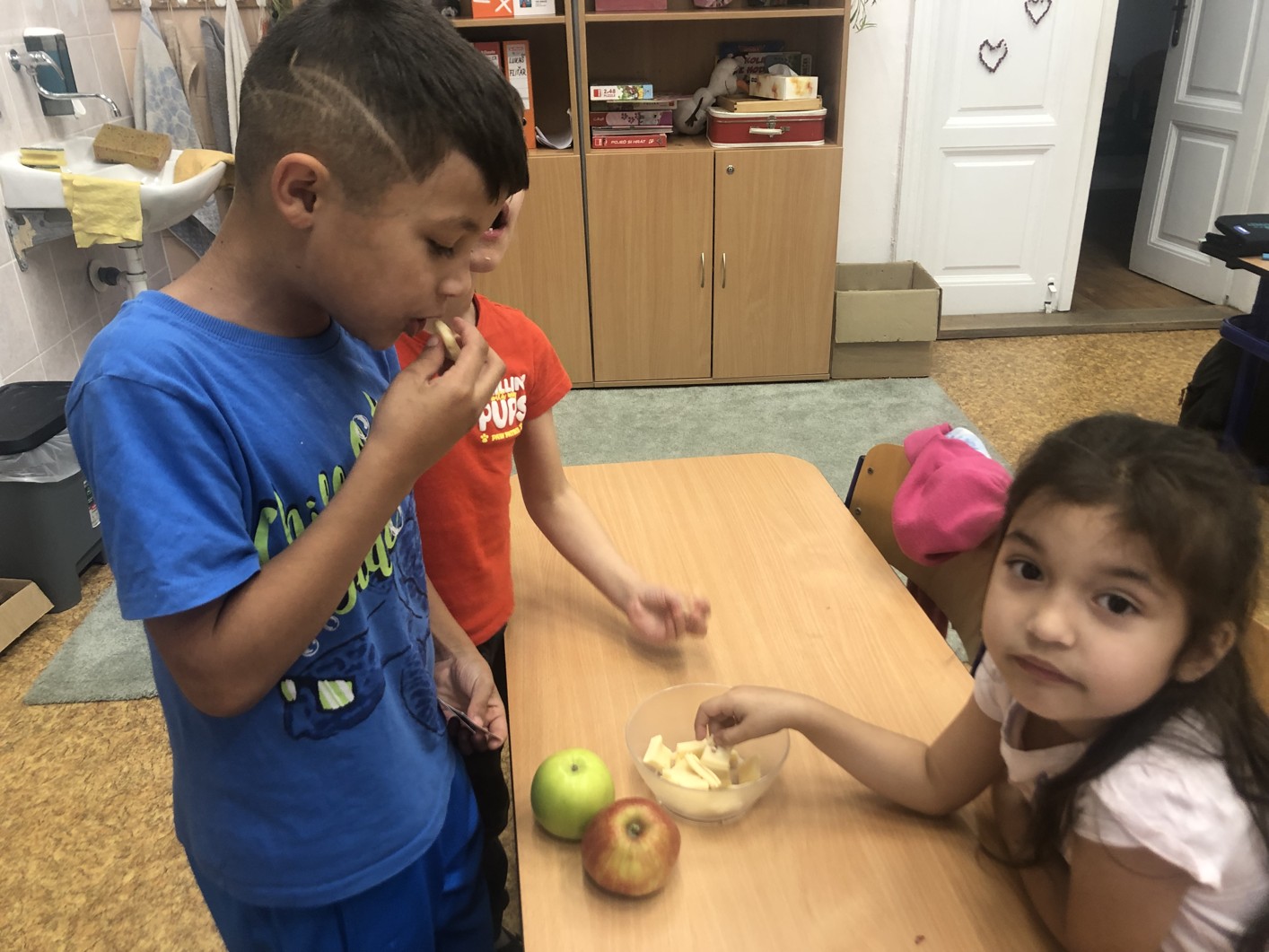 16. října jsme v 1. třídě uspořádali Jablíčkový den. Celý den jsme si povídali o podzimu, ovoci, zelenině. Pozorovali jsme jablíčka všemi smysly - osahávali, ochutnávali, očichávali i rozkrajovali. Pozorovali jsme barvy, velikosti i různé tvary. Už víme, jaký je život stromu od semínka až po jablíčko. Nakonec jsme si upekli výborný štrůdl a šlo nám to velmi dobře.