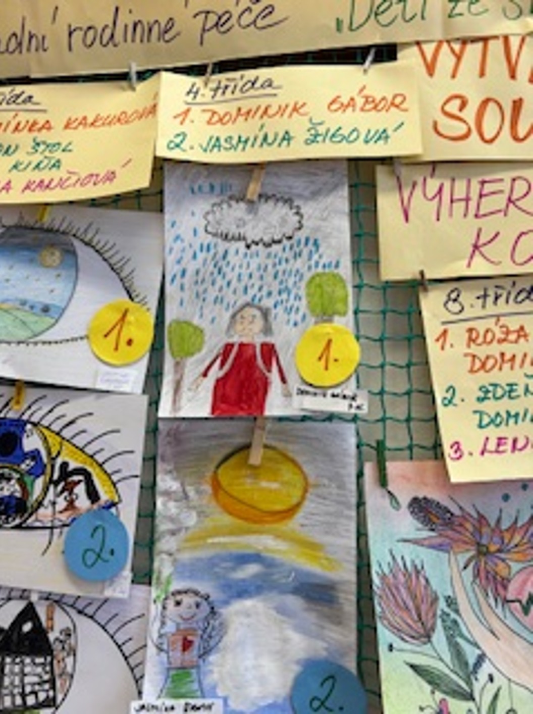 Žáci naší školy se velmi rádi účastní různých výtvarných soutěží. V letošním školním roce jsme vybrali tři různé soutěže. Dvě již tradiční a jednu zcela novou. Mezi tradičními zadavateli je BESIP a Sdružení hasičů. Zcela novou soutěž jsme letos zvolili od zadavatele Střediska náhradní rodinné péče. V každé kategorii jsme vyhlásili vždy první tři místa za každou třídu. Vyhlášení s diplomy jsme si pokaždé udělali slavnostně před všemi v tělocvičně. Všechny práce měly děti možnost obdivovat vždy na společné výstavě. Pro porotu bylo vždy velmi těžké rozhodnou a vybrat tři nejpovedenější práce, jelikož se všichni velmi snažili, aby jejich dílo bylo nejkrásnější.