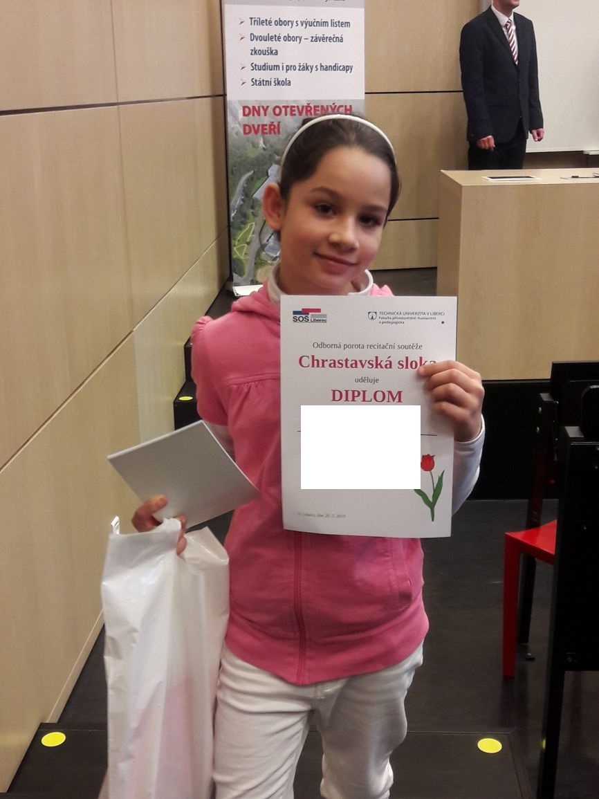 I v letošním roce jsme zajeli do Liberce bojovat o nejlepšího recitátora. Recitační soutěže probíhala v prostorách Technické university pod taktovkou SOŠ Liberec. Soutěžit se nás vydalo 5. Diana Žigová a Vanesa Bariová z druhé třídy byly oceněny za skupinovou recitaci a naším nejlepším recitátorem, tak jako v loňském roce, se stala Petra Pabišková ze 4. třídy, která ve své II. kategorii obsadila krásné 2. místo. Celá akce probíhala v duchu milých setkání s přáteli a kamarády a již teď se těšíme na další ročník.