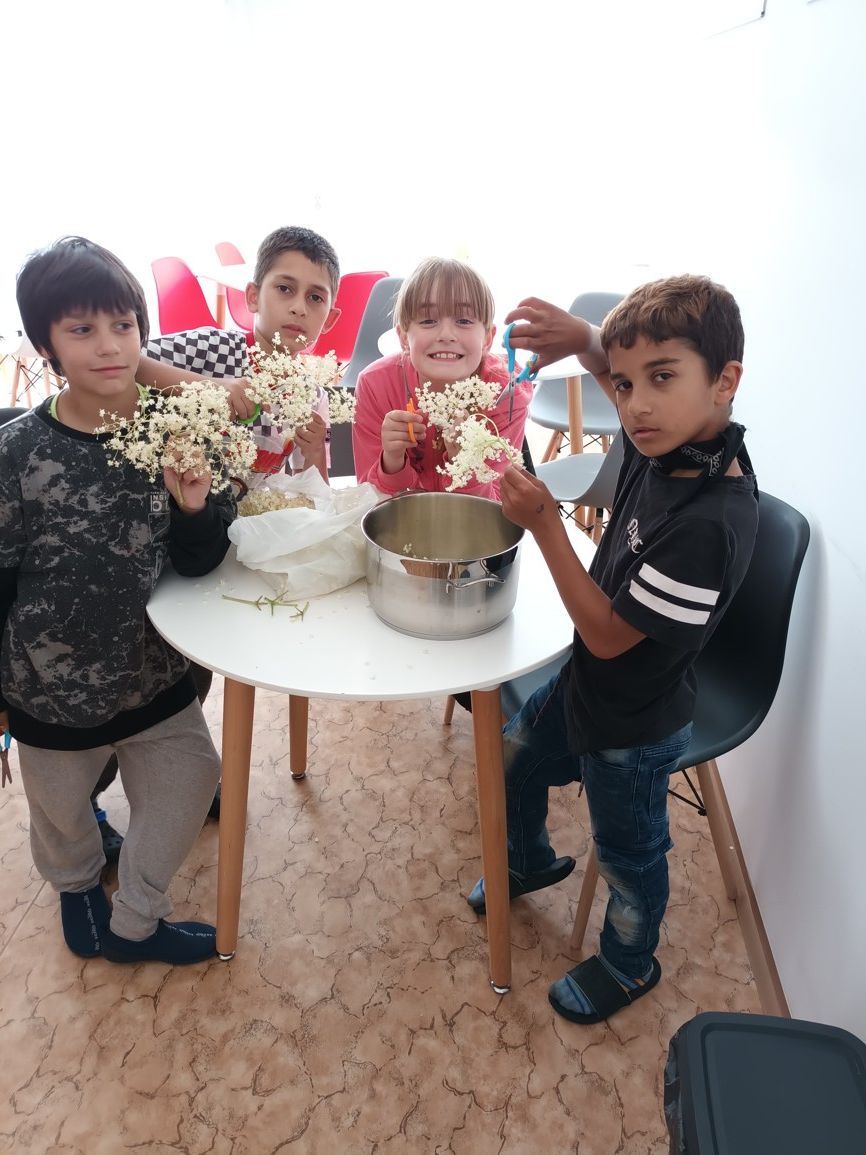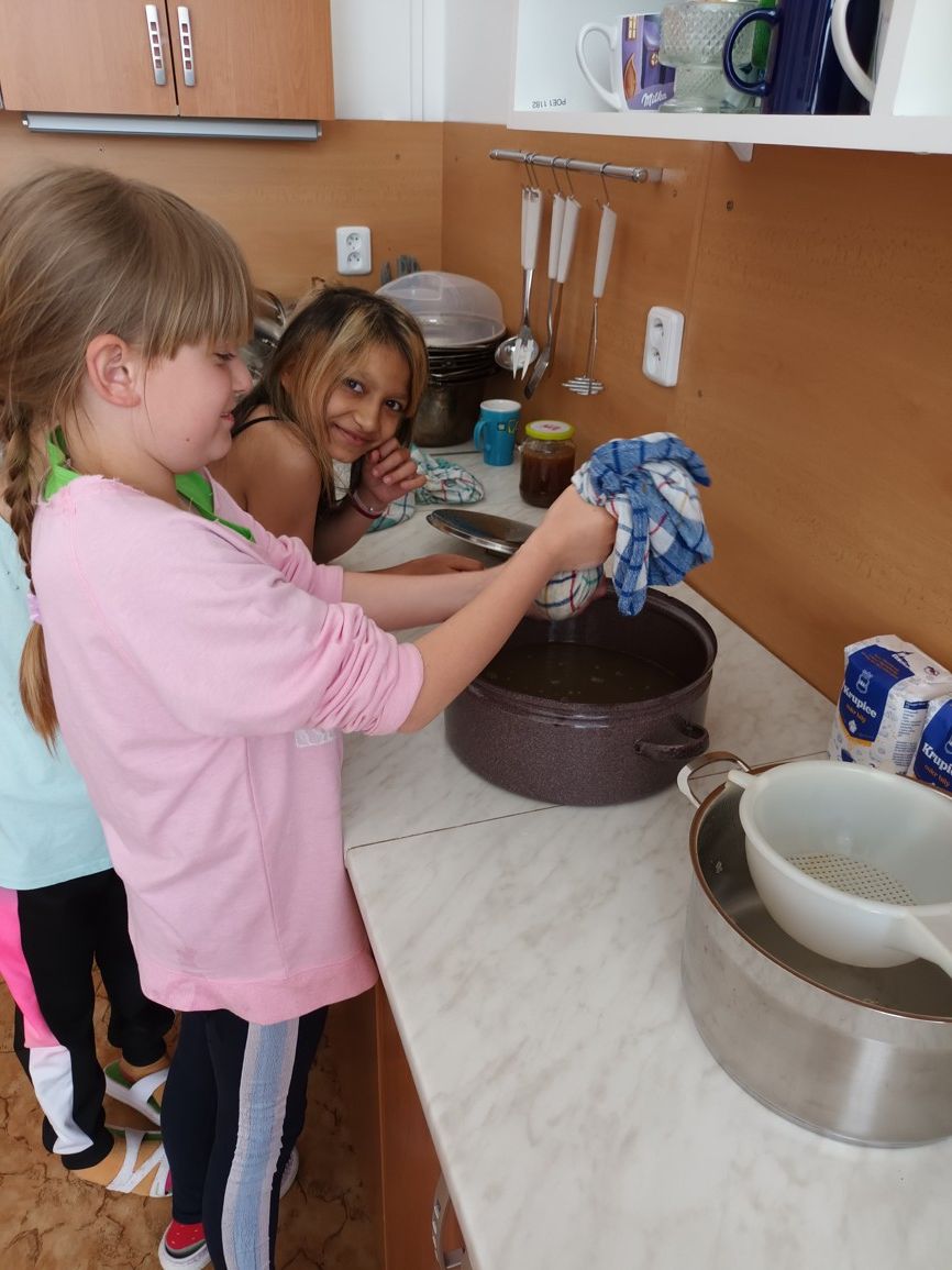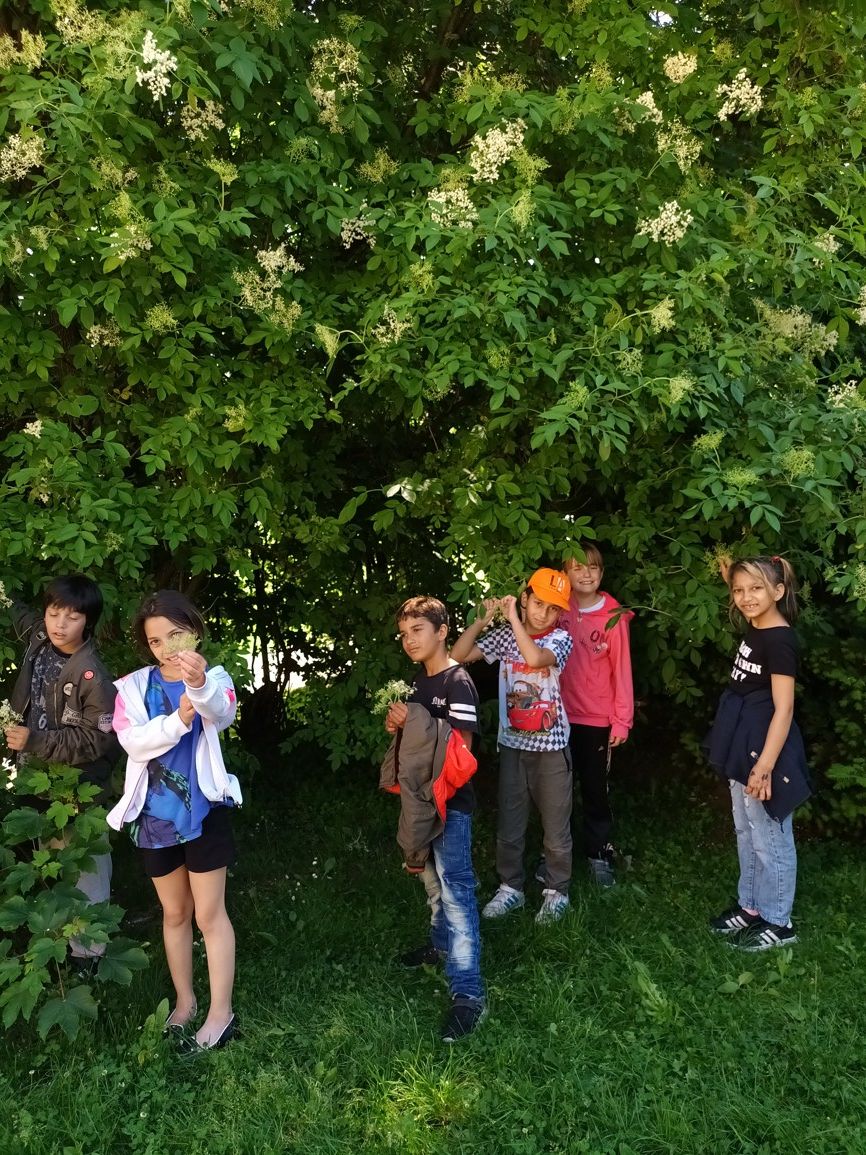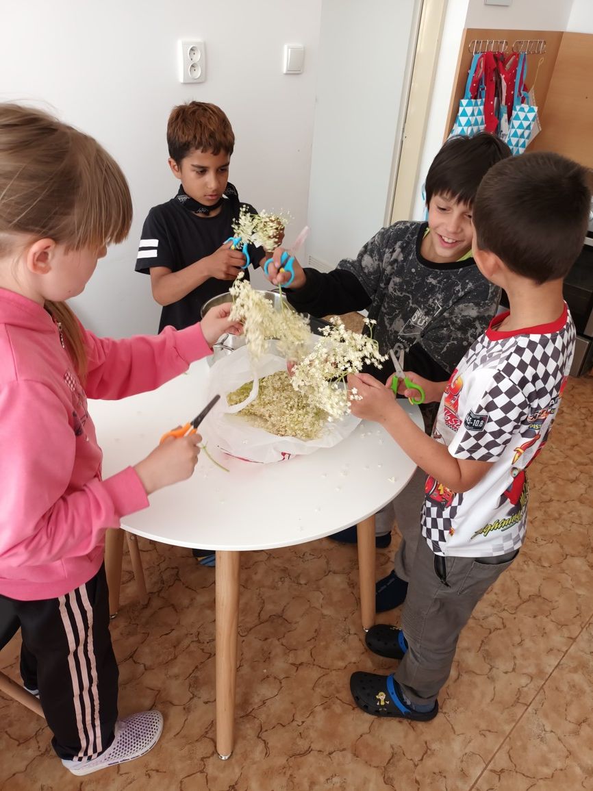 Ve středu 8.6. jsme se rozhodli vyrazit na sběr bezových květů a uvařit si z nich bezovou šťávu. Květy jsme natrhali, ve škole nastříhali do hrnce a přidali citrony a kyselinu citronovou. Další den, ve čtvrtek 9.6., jsme vše přecedili, vymačkali přes plátýnko do hrnce, přidali cukr a lehce povařili. Hotovou šťávu jsme nalili do skleniček, které si děti odnesly domů.