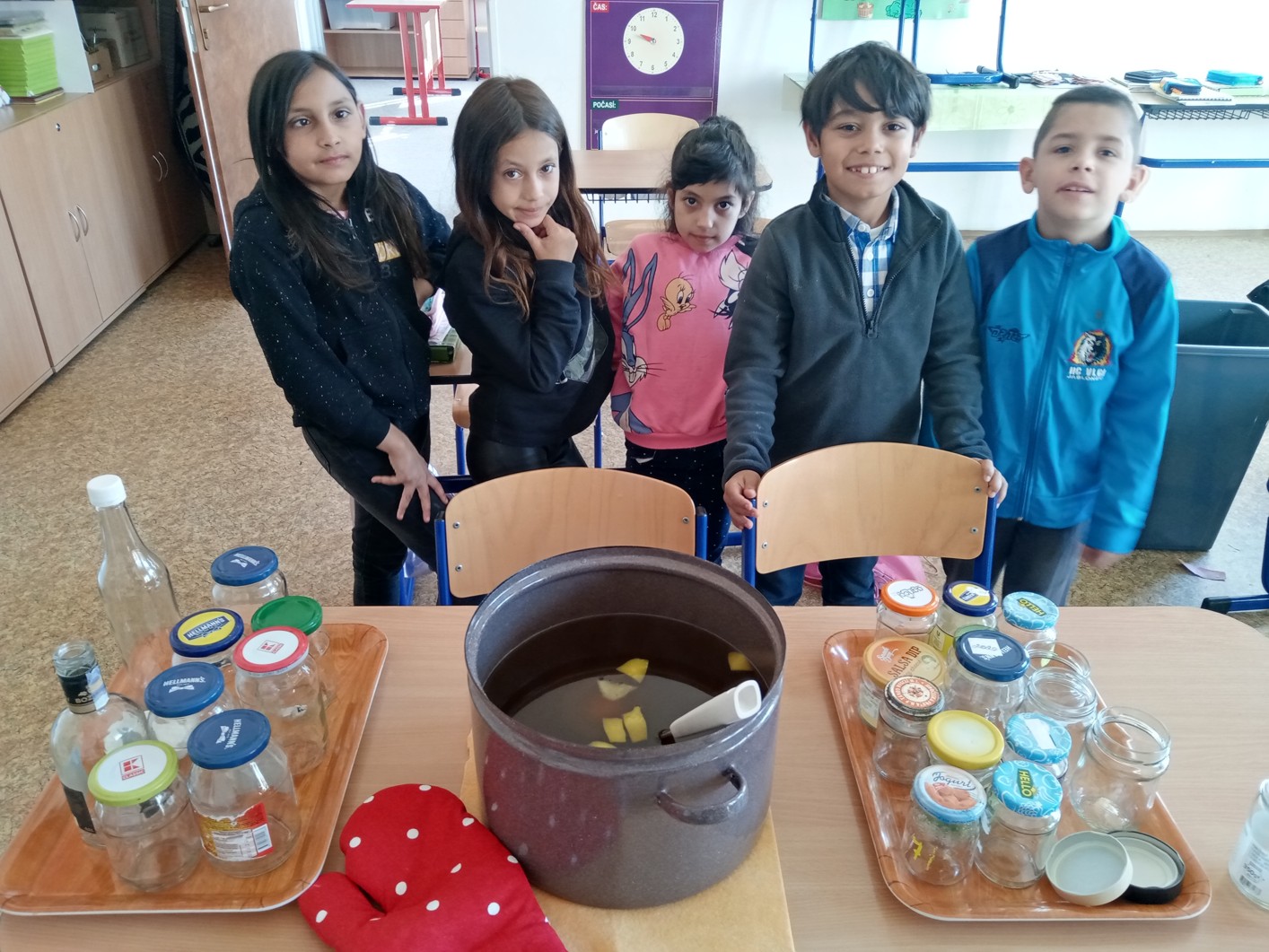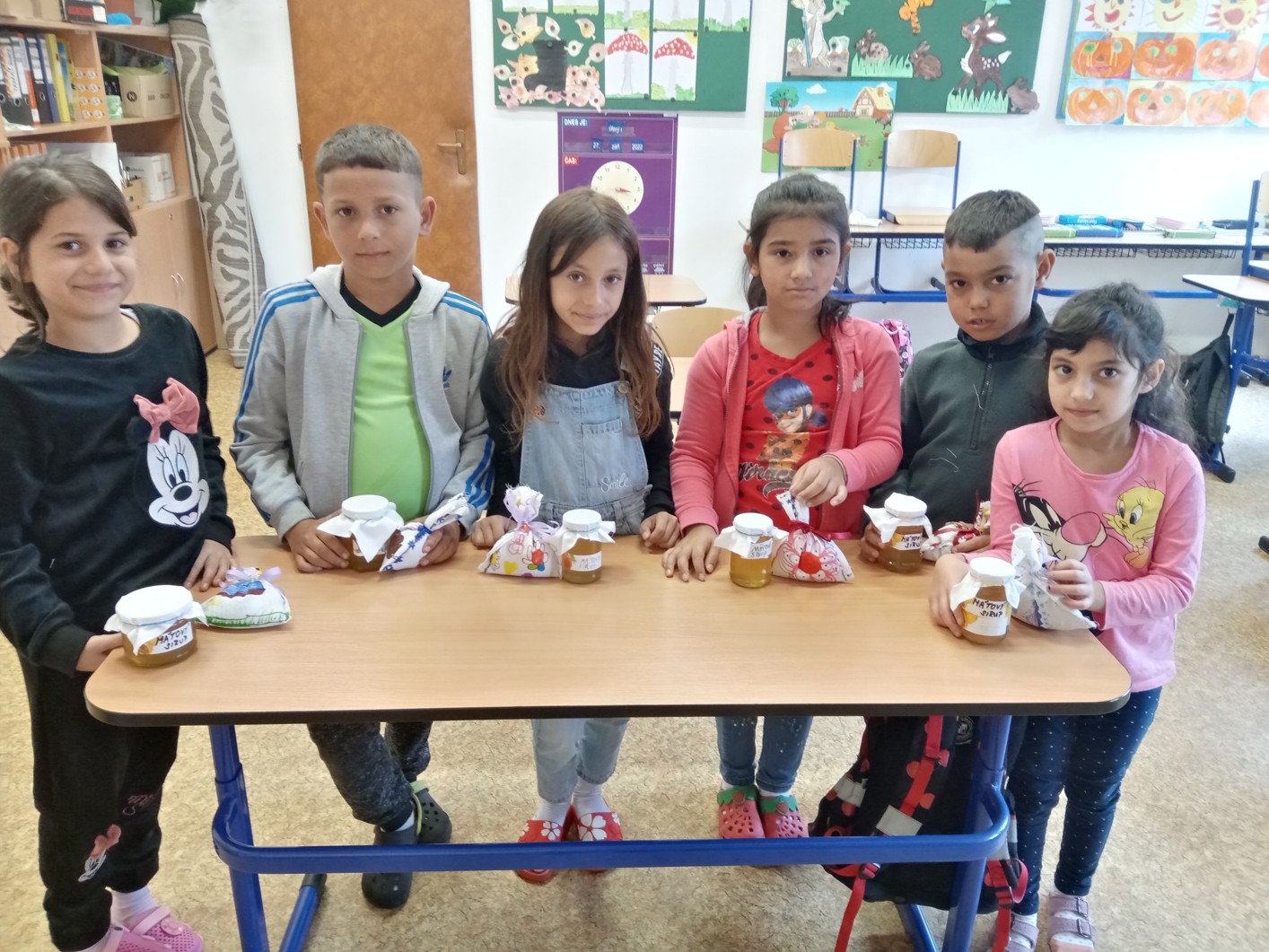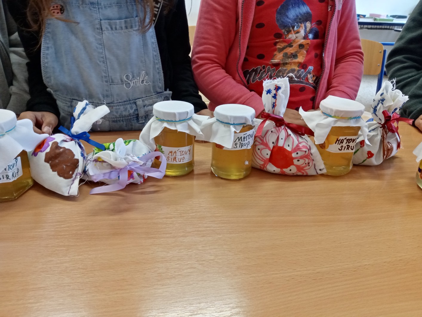 Mátu a meduňku jsme se rozhodli usušit. Tyto usušené nadrcené bylinky jsme dali do látkových pytlíčků, které jsme si sami nazdobili a ušili. Část máty jsme povařili s vodou a citronem, abychom o den později uvařili mátový sirup, který nám velice chutnal.