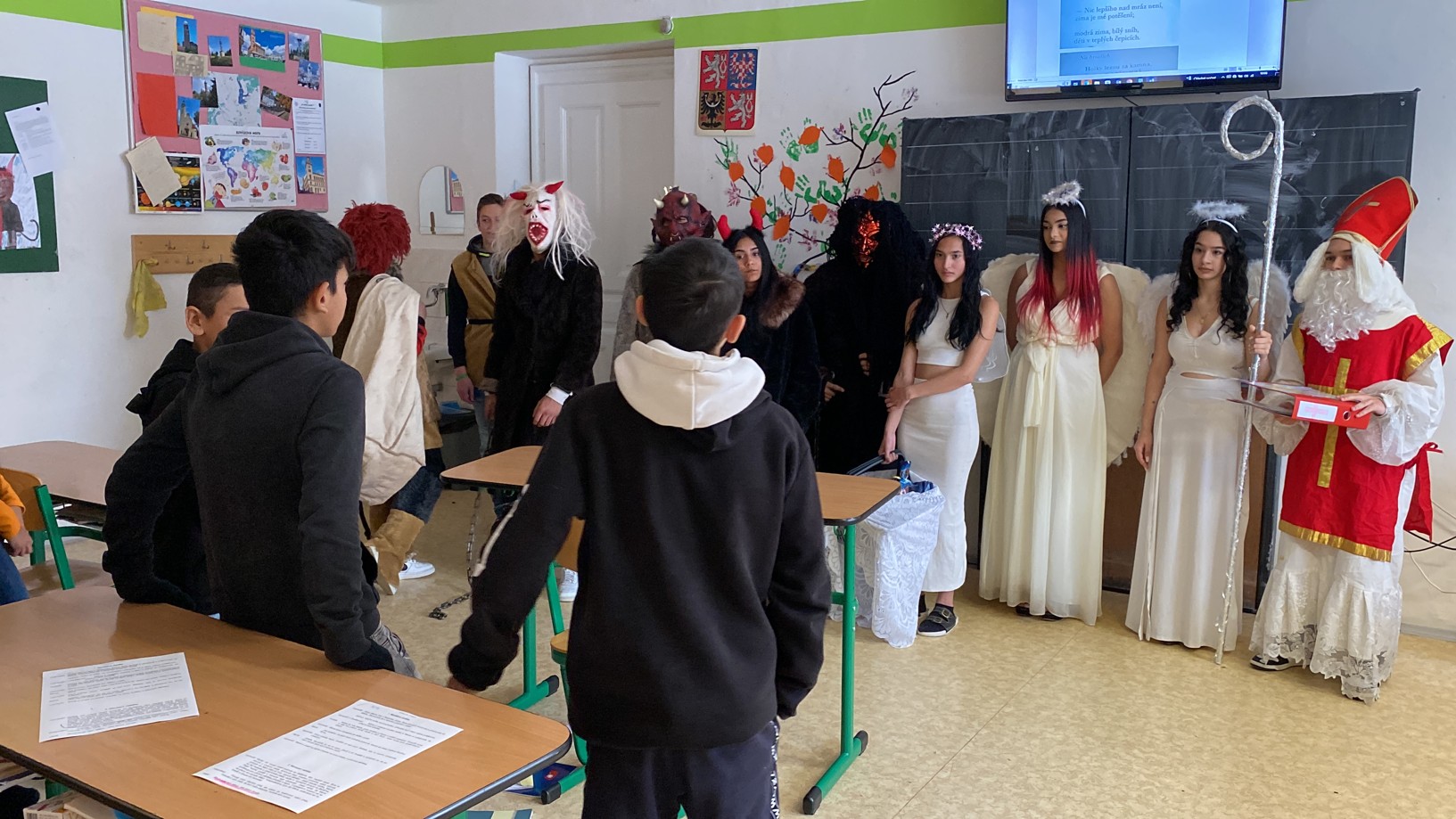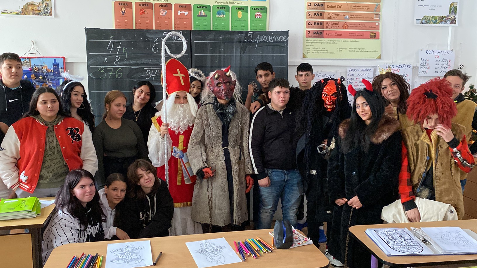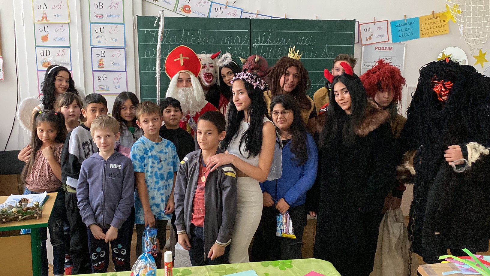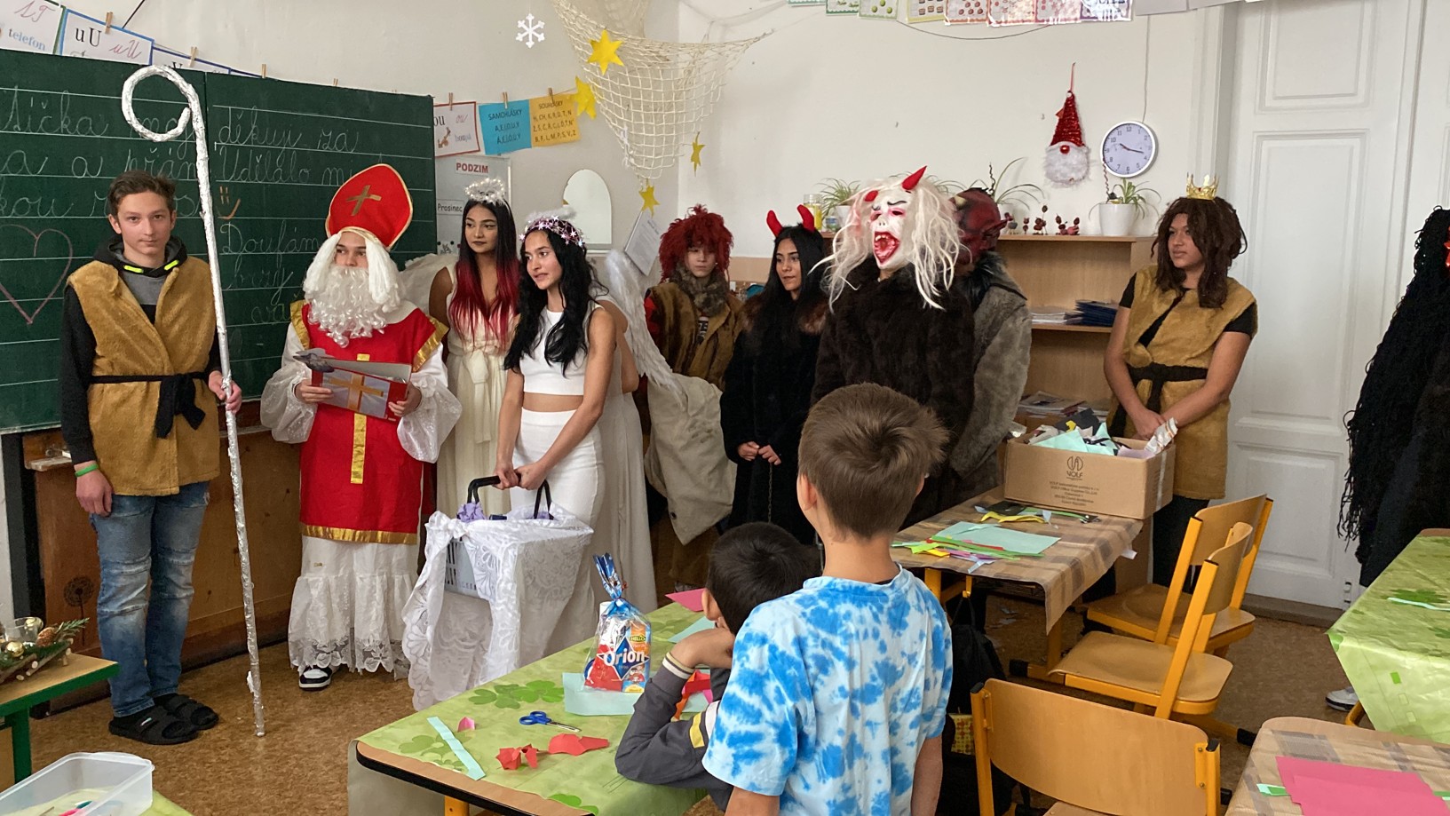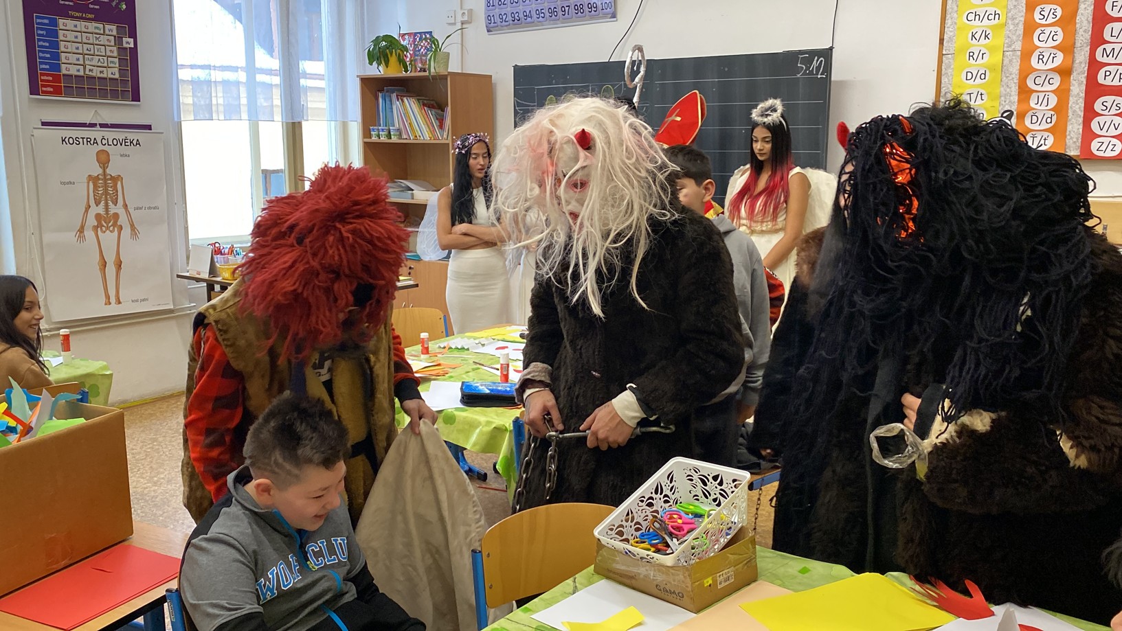 Stejně jako minulé roky obstarali akci Mikuláš na naší škole žáci deváté třídy. Postupně obešli všechny třídy, aby si poslechli připravené básničky, a potom za odměnu obdarovali své spolužáky mikulášským balíčkem. Našim deváťákům a jejich třídnímu učiteli děkujeme za bezproblémové zajištění akce.