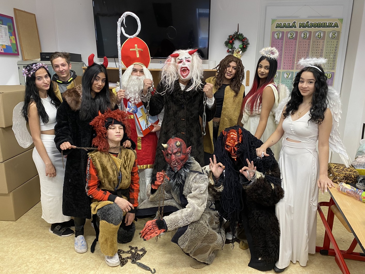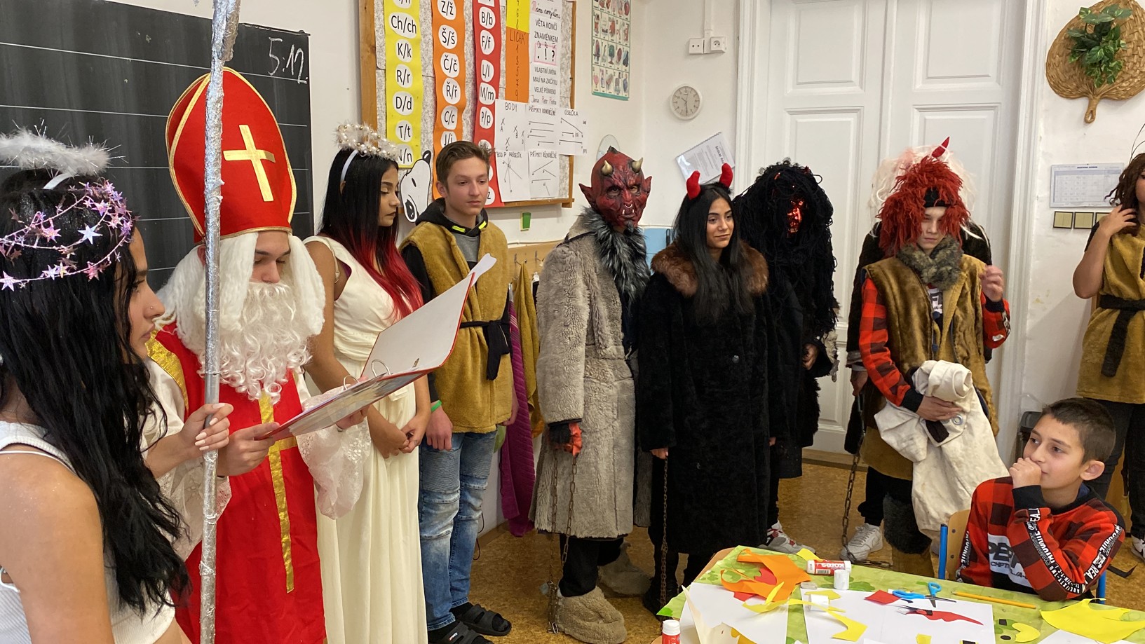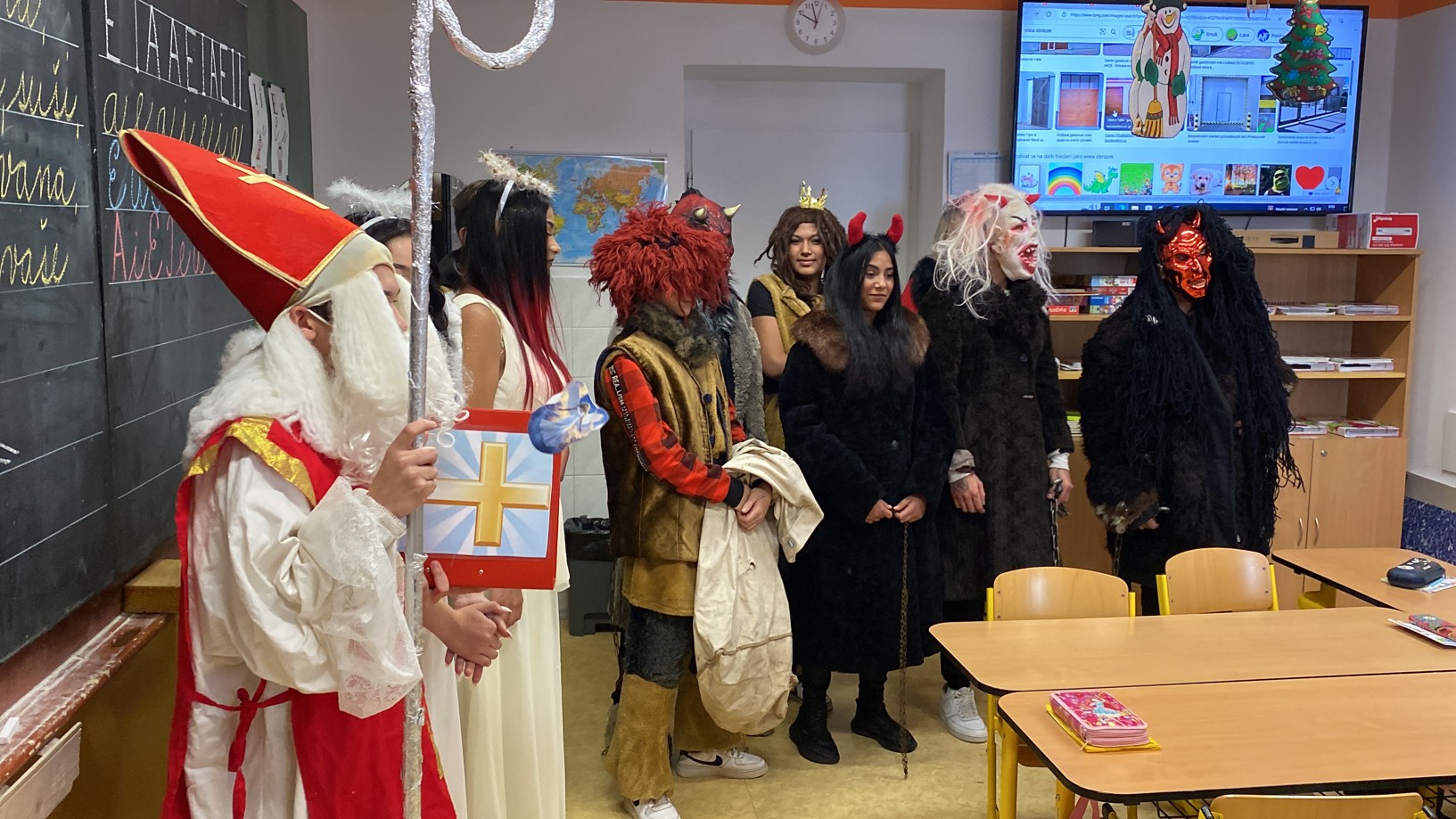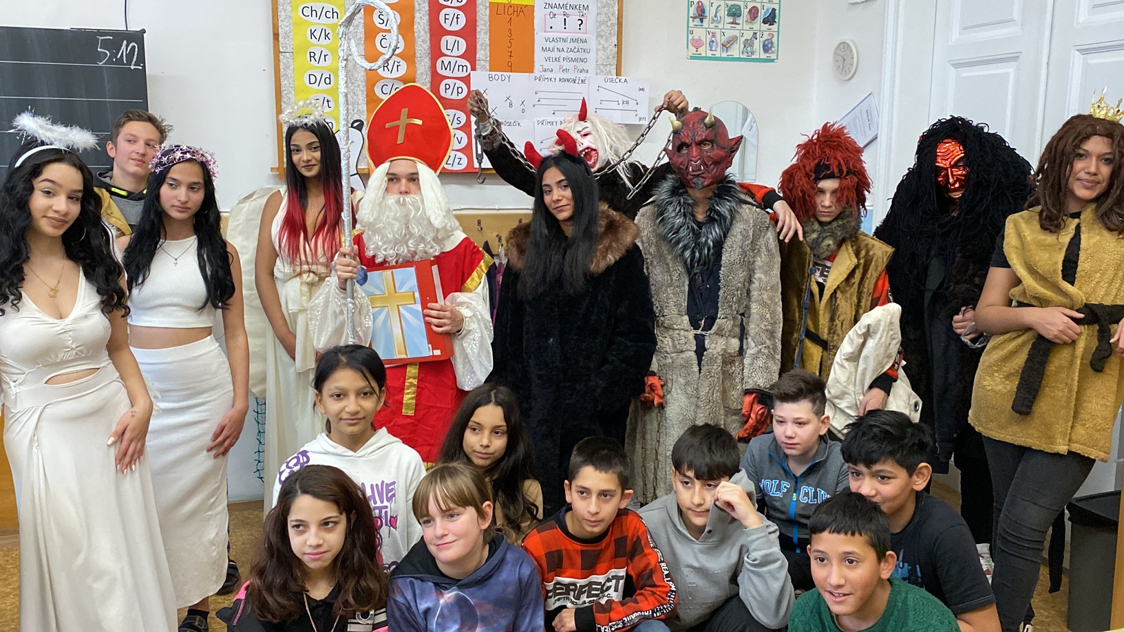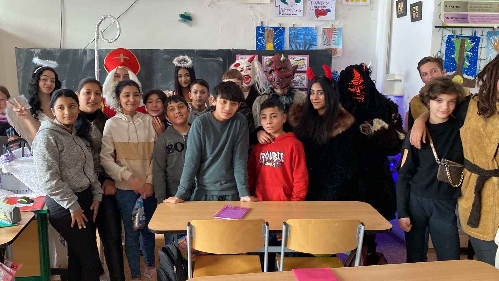 Stejně jako minulé roky obstarali akci Mikuláš na naší škole žáci deváté třídy. Postupně obešli všechny třídy, aby si poslechli připravené básničky, a potom za odměnu obdarovali své spolužáky mikulášským balíčkem. Našim deváťákům a jejich třídnímu učiteli děkujeme za bezproblémové zajištění akce.
