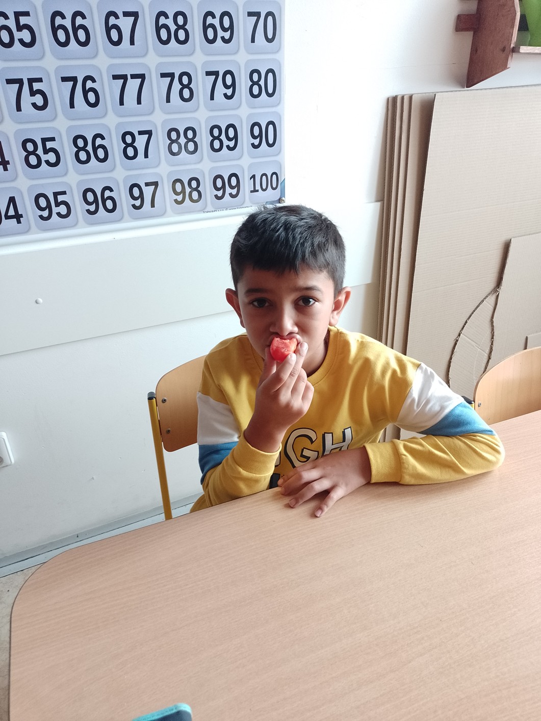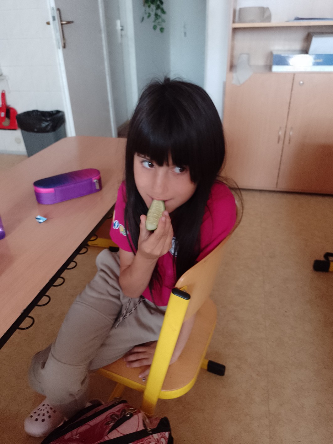 Přišel podzim a nastal čas na zhodnocení úrody na naší zahradě. Na jaře jsme do záhonku zasadili: rajčata, polní okurku, papriky, lilek, patyzon. Ještě před koncem školního roku jsme chodili zahrádku kontrolovat a zalévat. Díky letošnímu teplému létu se rostlinkám dařilo. Po návratu do školy jsme byli překvapeni, kolik se urodilo rajčat, která ještě o teplém začátku školního roku dokázala dozrát. Ani sazenice polní okurky nezklamala, i když nám dala pouze jednu okurku. Velkým překvapením byl pro nás patyzon. Plodina pro nás naprosto neznámá. Bohužel než jsme stačili sklidit, pochutnal si na něm nějaký živočich. A tak máme patyzon alespoň na fotografii. Papriky ani lilek se neurodily. Na okurce a rajčatech jsme si všichni pochutnali o velké přestávce a zpestřili jsme si dopolední svačinu.